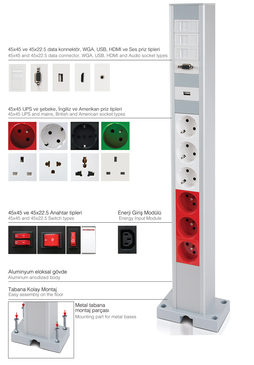 Features; Aluminum anodized insulation body with access to electricity,data and multimedia. Easy assembly.